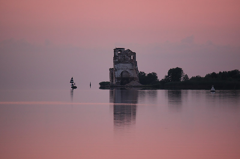 «Светлый-светлый», «белый-белый» храм, о котором говорит Анор, – это три стены и колокольня, торчащие прямо из воды. Церковь Рождества Христова, построенная в конце XVIII века у самого берега Белого озера, у истока реки Шексны – единственный в России храм на воде, сохранившийся после затопления огромных территорий при строительстве Волго-Балта.