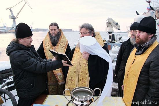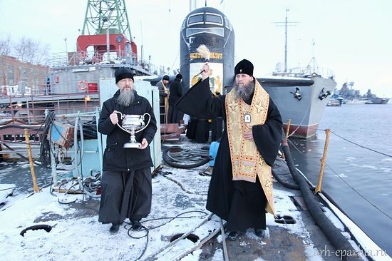 Архиереев сопровождали морские офицеры во главе с командиром подлодки капитаном второго ранга Денисом Семьянских.