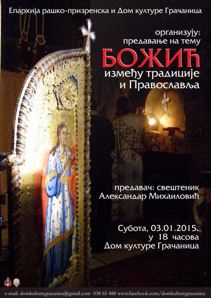 Епархија рашко-призренска и Дом културе Грачаница, поводом предстојећих празника, организују предавање "Божић између традиције и Православља". На ову тему говориће свештеник Александар Михаиловић у суботу 03.01.2015, у 18.00 часова, у Дому културе у Грачаници.