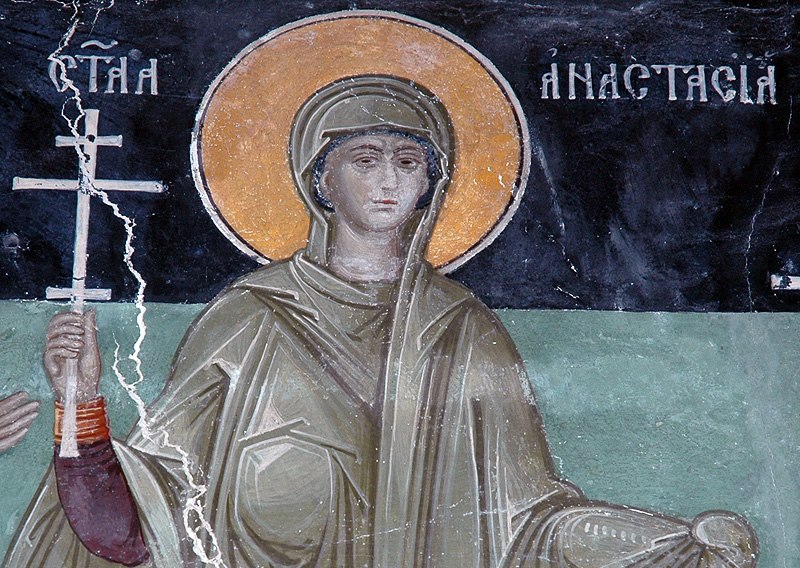 А кад свану, мученикољубива Анастасија блажена по обичају свом дође у једну од тамница, и не нашавши никога она испуни ваздух плачем и ридањем. Упитана од тамошњих војника зашто тако рида, она одговори: Тражим слуге Бога мога који јуче беху у овој тамници, а сада не знам где су. - Војници пак, познавши да је хришћанка, одмах је ухватише и одведоше к царском намеснику Илирије Флору. Када намесник упита свету Анастасију: Јеси ли хришћанка? она громогласно одговори: Ваистину, хришћанка сам. Јер што теби изгледа одвратно, то је мени премило. Назив хришћанин за вас је богохулан, а за мене драгоцен и славан. - Када пак намесник сазнаде да је Анастасија из Рима и високог рода, он је упита: Шта те онда покрену да оставиш своје славно отачаство Рим и дођеш овамо? - Светитељка одговори: Шта друго осим глас Господа мог који ме призива к себи, јер Њему јединоме следујући, ја оставих отачаство и пријатеље, и узевши крст Христа мога, брзим и радосним корацима кренух стопама Његовим. - Намесник је упита: Где је тај кога ти називаш Христос? - Светитељка одговори: Нема места где Христа не би било. Он је на небу, Он је у мору, Он је на земљи, Он је и у свима који Га призивају и боје Га се, просвећујући им разуме и свагда пребивајући с њима. - Намесник је упита: Где су ти који се боје Христа твога, о којима говориш, кажи нам да их упознамо? - Светитељка одговори: Досада беху с нама на земљи у телу, а сада су, оставивши ово доле, на небесима, и са висине гледају на нас: јер им то издејствова смрт коју примише за Христа. Мећу њих бићу увршћена и ја, јер желим да кренем истим путем којима и они.