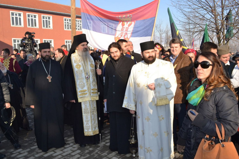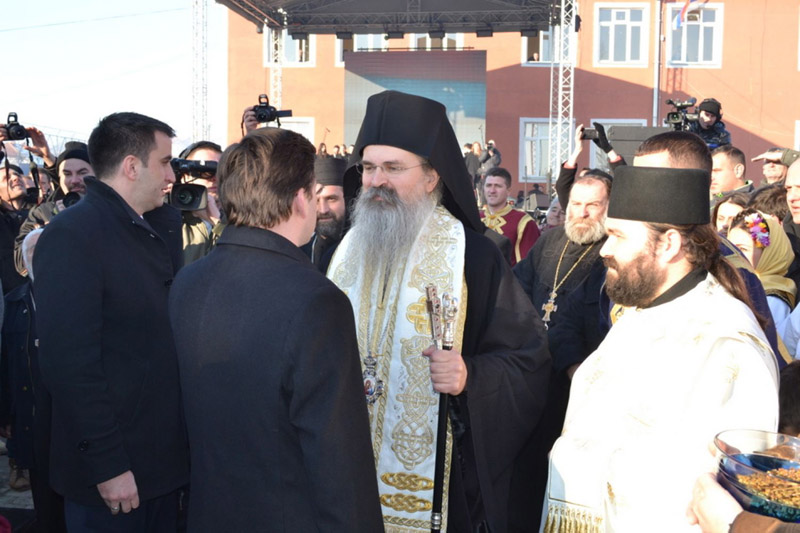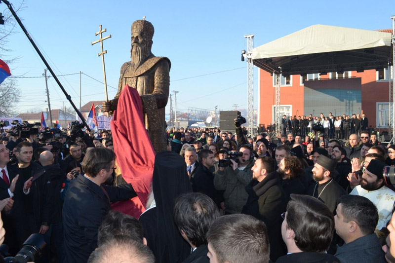 Епископ рашко-призренски г. Теоодисије са народом дочекао је 14. јануара 2015. године премијера Србије г. Александра Вучића у Грачаници и освештао споменик краљу Милутину