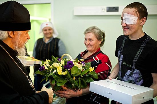 «Святейший Патриарх желает тебе скорейшего выздоровления. Ты очень мужественно себя вел. Мы все видели по телевизору, как ты отказался от обезболивающих. Я думаю, что ты настоящий мужчина. Все у тебя будет хорошо», — сказал Ване епископ Пантелеимон. Он передал мальчику от Патриарха Кирилла портативный компьютер MacBook, чтобы тот мог слушать в больнице аудиокниги, и икону преподобномученицы великой княгини Елизаветы Федоровны.