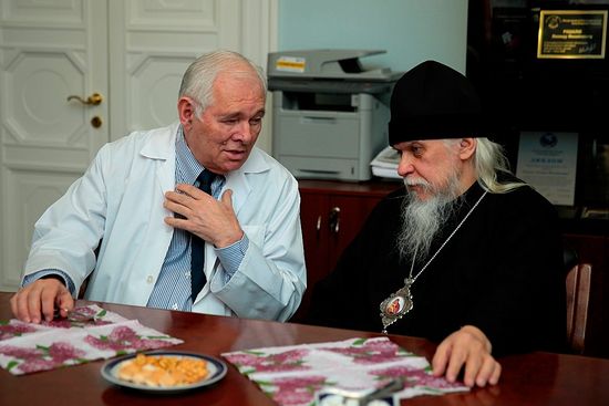 После встречи с больными епископ Пантелеимон встретился с главврачом клиники Л.М. Рошалем и обсудил перспективы сотрудничества между Синодальным отделом по благотворительности и создающимся в настоящее время «Фондом детского доктора Рошаля».