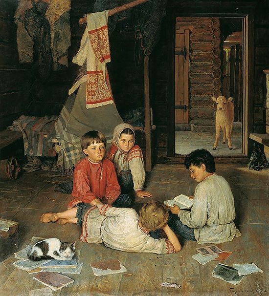 Стоит отметить, что в качестве пропаганды «темного царства» дореволюционной России, как правило, в учебниках и альбомах тиражировали картину Н.П. Богданова-Бельского «У дверей школы», на которой изображен мальчик в лохмотьях, нерешительно заглядывающий в класс. А такие работы, как «Ученицы», «Именины учительницы» (1910), «Деревенские друзья» (1912–1913) и многие другие изображения нарядных и опрятных, явно не бедных крестьянских детей, несправедливо отодвигались в запасники народной памяти.