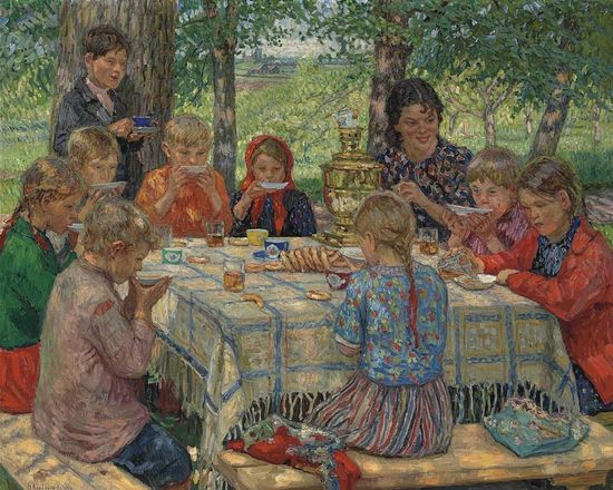 16-летним юношей Богданов-Бельский приехал в Татево, много писал, живя в доме Рачинских. Надо сказать, что почти все его пейзажи и картины 1890–1900-х годов, а также портреты деревенских детей написаны художником здесь, на родине, в старинном селе Татеве. И потом, уже в эмиграции, художник будет возвращаться памятью в этот яркий, песенный, самобытный крестьянский мир родного села и воспроизводить его на своих картинах – для потомков, для истории.