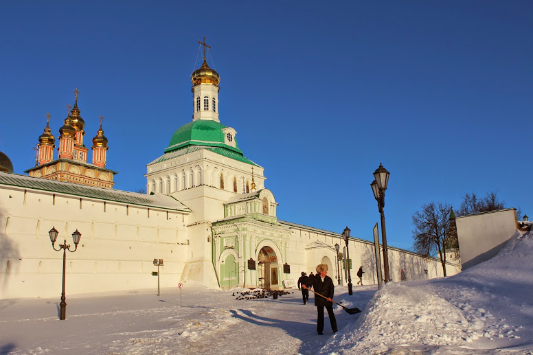 Јури електрични воз из мрачне Москве и пристиже у зором окупану Лавру. Светлост се лепи за старе шећерно-беле зидове, а златни одсјај са крстова прелива се по јарко-плавом небу какво се само може замислити. Светлуца снег. Прво одредиште, наравно, представља одлазак ка Преподобном: трепере у дубини кандила над кивотом, и код стуба, погнуте главе, клечи неки монах. „Преподобни Сергије, помози“ – молим се и јурим назад у сунчано јутро.