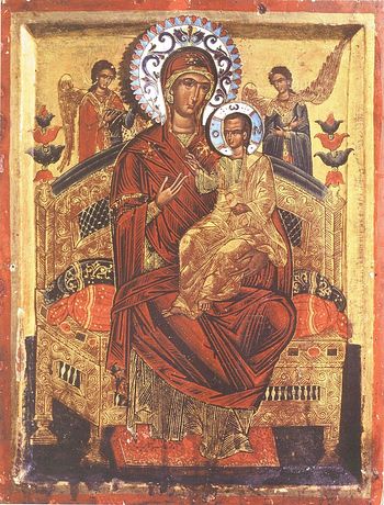 «Алтарницу» редко выносят из Алтаря, где она постоянно стоит на горнем месте, рядом со все той же неугасимой свечей. Обычно это происходит на большие праздники, так что мне очень повезло, и возможно я смогу к ней даже приложиться. Сейчас к ней подойти пока еще нельзя – икону оградили специальным ограждением, а откроют его в конце службы, когда монахи, а затем и паломники, будут прикладываться к иконам и благословляться у священнослужителей. А вот и икона Божией Матери «Всецарица»! Это одна из моих самых любимых икон Богородицы. В России есть много чудотворных списков «Всецарицы», как правило, все они большие, величественные. Сама же икона, ее первообраз тут в Ватопеде, такая непривычно маленькая, наверно формата А3, пожалуй, самая маленькая среди семи чудотворных икон монастыря, но вместе с тем такая добрая и теплая! Находится она слева от Царских Врат, перед колонной. В афонских храмах есть такой обычай: перед любой иконой, даже если она в иконостасе, вешают ее список на доске гораздо меньшего размера. Делается это, наверно, для сохранности самих икон: прикладываются не к первообразу, а к его списку. Правда есть несколько чудотворных икон на Афоне, перед которыми не установлен список. Например «Иверская» или «Скоропослушница». Они полностью закрыты специальным толстым стеклом. Но что касается «Всецарицы» - тут все иначе! На массивной колонне изображен внушительный список с нее, а сам первообраз расположен внизу.