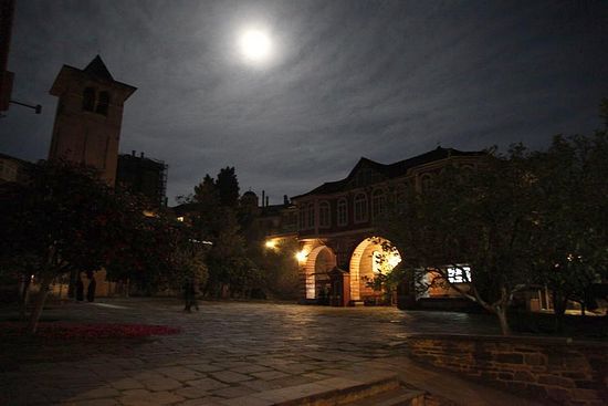 Конечно, стоять на такой длинной службе, да еще и с непривычки, очень непросто. Уже глубокой ночью у меня стали болеть ноги, я боролся со сном, пытаясь не отключиться прямо стоя на службе. Один раз мне удалось присесть на освободившуюся рядом стасидию, но продлилось это блаженство не больше десяти минут. Ко мне подошел монах и знаками попросил уступить место другому монаху. Однако должен признать, что если бы я просто слушал службу и не молился, я бы наверно не выдержал и свалился еще часа в два ночи. В эту ночь я молился так, как, наверно, не молился еще никогда. Было к этому какое-то внутреннее произволение. Я непрерывно молился о себе, родителях, духовенстве, всех родных и близких мне людей, мысленно перебирал в уме выученные наизусть имена из помянника. Это был невероятный молитвенный опыт. К сожалению, в светской жизни повторить даже что-то близкое к той ватопедской молитве весьма непросто. Часто, даже придя в храм на богослужение и начав молиться, через некоторое время понимаешь, что мысли улетели куда-то далеко от молитвы и нужно начинать заново. Но на Афоне даже воздух помогает в усердной молитве. И особенно явно я понял это сейчас – на первом в своей жизни ночном монастырском богослужении.