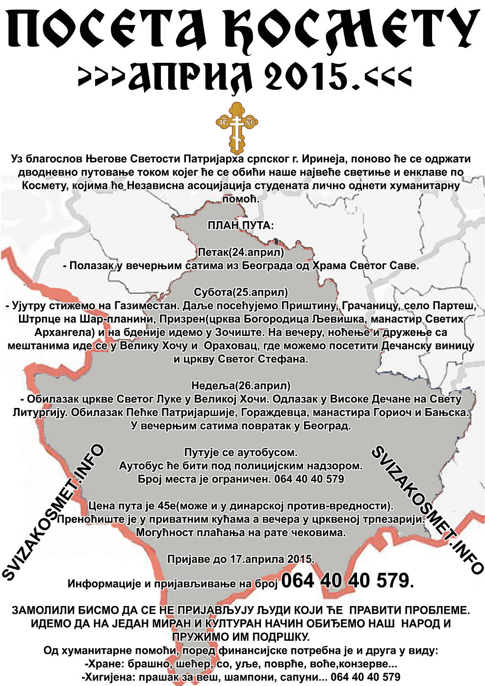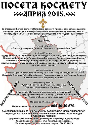 Уз благослов Његове Светости Патријарха српског г. Иринеја, поново ће се одржати дводневно путовање током којег ће се обићи наше највеће светиње и енклаве по Космету, којима ће Независнa асоцијацијa студената лично однети хуманитарну помоћ.