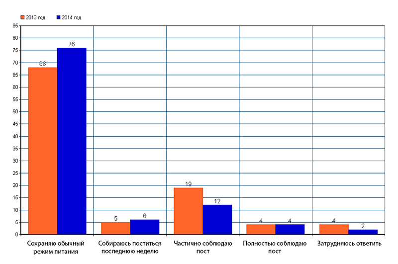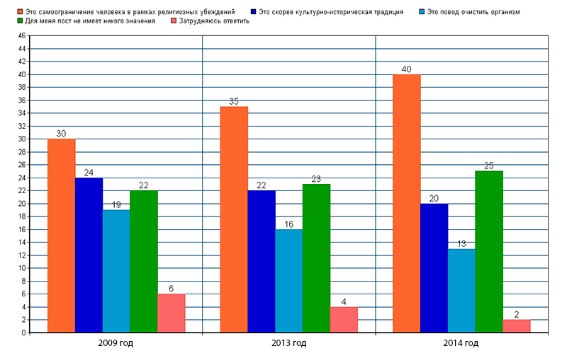 М.К.: Кстати, группа, для которой пост – повод очистить организм, численно сокращается: в 2009 году – 19%, в 2013-м – 16% и в 2014-м – 13%. А вот группа по самоограничению в рамках религиозных убеждений выросла на 10%.