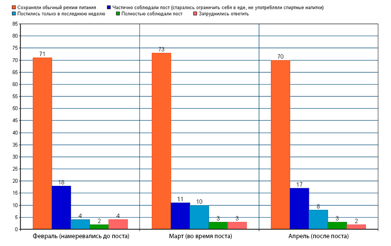 М.К.: Приведу данные. ВЦИОМ опрашивал россиян в 2013 году в начале поста и в конце. Процент респондентов, которые полностью (строго) соблюдают пост, в начале и в конце поста остался неизменным: сколько начали строго поститься, столько же и продолжили. «Слетают» те, кто планировал поститься частично: их к концу поста стало меньше на 7%. Доля тех, кто намеревался поститься только в последнюю неделю, не изменилась.
