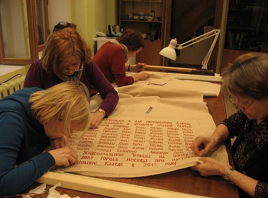 Украшавање плаштанице у складу са староруском црквеном традицијом извршили су парохијани као испуњење завета који су дали током свог поклоничког путовања у манастире Св. Давида Гаређијског 2011. године.