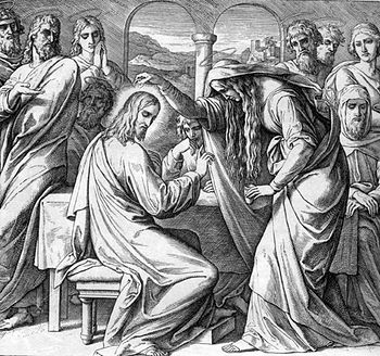 А Марија узевши литру правога нардова многоценог мира помаза ноге Исусове, и отре косом својом ноге његове, а кућа се напуни мириса од мира. Прва два јеванђелиста пишу, да је жена просула миро на Христову главу, при чему свети Марко још додаје: разбивши скленицу леваше му на главу. Најскупоценија мира држана су у добро залемљеним и тврдо запечаћеним скленицама. Жена је разбила грлић од стаклета, па је онда излевала миро најпре по Његовој глави па онда - у знак неизмерног поштовања према Њему и своје сопствене смирености - и по ногама. Она се није трудила да лагано отвори стакло него га је разбила још и зато што је имала намеру да све миро, без остатка, излије на Господа. И тако, док је Марта служила по кући и око трпезе као и увек, дотле је Марија на свој начин одавала пошту чудотворном Учитељу. Две рођене сестре изражавале су своје поштовање према Господу на два разна начина. Другом једном приликом кад је опет Марта служила а Марија седела крај ногу Христових и слушала Његове свете речи, Господ је одао већу похвалу Марији но Марти рекавши: Марија је добри дијел изабрала (Лк. 10, 42) хотећи тиме да истакне претежну важност духовне ревности над телесном ревношћу. Сада пак Марија је набавила скупоцено нардово миро и, по источноме обичају, левала га по глави и по ногама Онога који је Својом надприродном чистотом омивао и миросавао њену душу. При овоме догађају присутни су се поделили у осећају, сви су ћутали и ћутањем одобравали поступак Маријин, но један само од њих нити је ћутао нити је тај поступак одобравао. Ево како јеванђелист, који је и сам био присутан ту, описује негодовање тога једнога: онда рече један од ученика његових, Јуда Симонов Искариотски, који га намераваше издати: зашто се ово миро не продаде за триста гроша и не даде сиромасима? А ово не рече што се стараше за сиромахе него што беше лопов, и имаше ковчежић, и носаше што меташе у њ. Према првој двојици јеванђелиста није сам Јуда негодовао него и остали ученици (Матеј) или још неки од присутних (Марко). Да су још неки негодовали, било тајно у души било полугласно, јасно је и из одговора Христовог у данашњем јеванђељу: не дирајте у њу .... јер сиромахе свагда имате са собом а мене немате. Господ, дакле, одговара у множини. Но ма колико њих да је негодовало и ма како да је опажљиво било њихово негодовање, главно је да је Јуда најљуће, најгласније и најизразитије негодовао. Зашто јеванђелист Јован спомиње само њега? И то још га нарочито бележи са пуним именом, и са ознаком издајника? Да га читаоци не би помешали са другим Јудом апостолом. Јуда протествује, дакле, зашто се оно скупоцено миро изли бадава а не продаде, и новац не раздели сиромасима. Он означава и високу цену тога мирисног уља: триста пењаза, или триста гроша. То је заиста висока цена једне скенице мира; то износи неколико златних дуката. Но то баш показује превисоко страхопоштовање које је Марија имала према Господу Исусу. Ко зна колико је времена она штедела док је заштедела толики новац, да га одједном утроши, и тиме овековечи један тренутак времена? Јуду је дубоко заболело то што тих неколико златних дуката нису звекнули у његов ковчежић. Јеванђелист отворено каже да он беше лопов. Наравно, да је Господ то знао, тј. знао је, да Јуда подкрада ковчежић, у који су сабиране добровољне жртве за издржавање сиромаха. Но и ако је то Господ знао, О