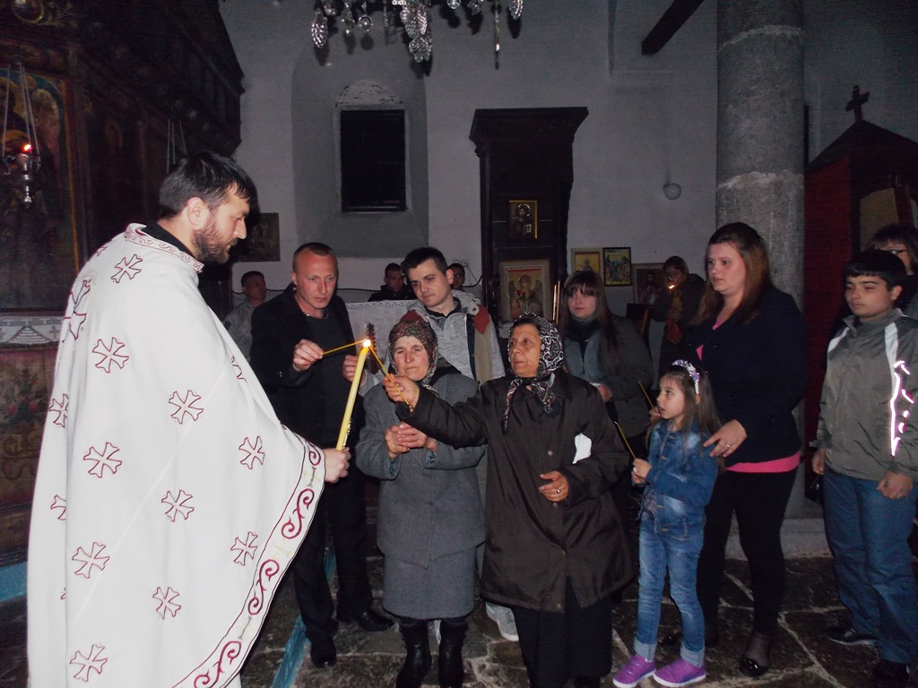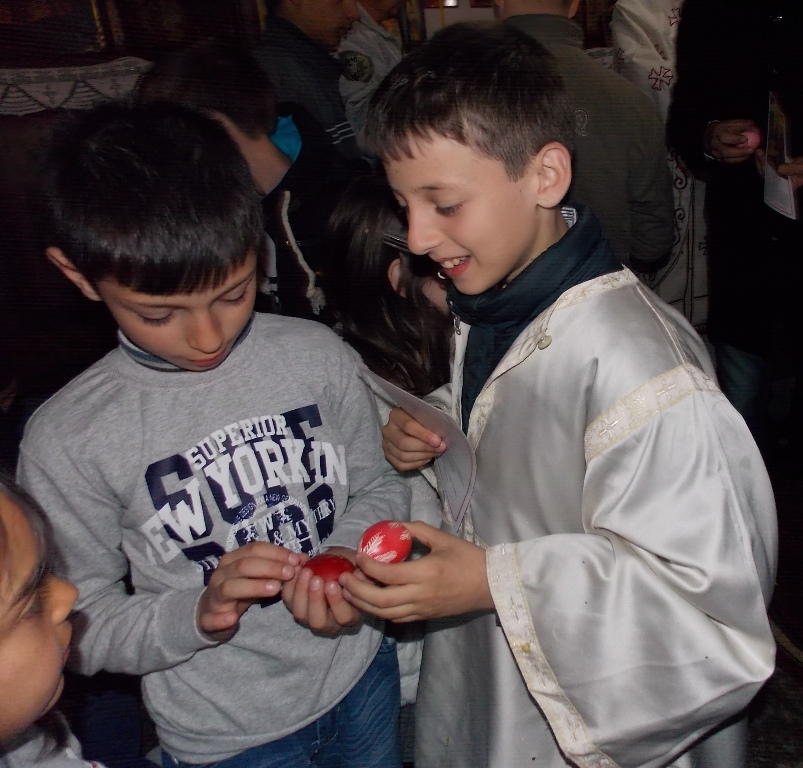 Уследило је куцање васкршим јајима, радост се пренела у црквену порту, а потом се преселила у све домове. Са зором већ, дечица су се размилела по комшилуку и родбини, честитала Васкрсење и добијала црвена Васкршња јаја на дар. У новом руху добијеном од родитеља за овај празник, из куће у кућу проносила су деца вест о Христовом Васкрсењу, а одрасли, са покојом сузом радосницом, даривали су их и по којом чоколадом или другим слаткишем.