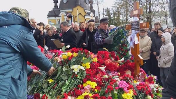 Люди принесли большое количество цветов, некоторые были перевязаны георгиевскими ленточками.