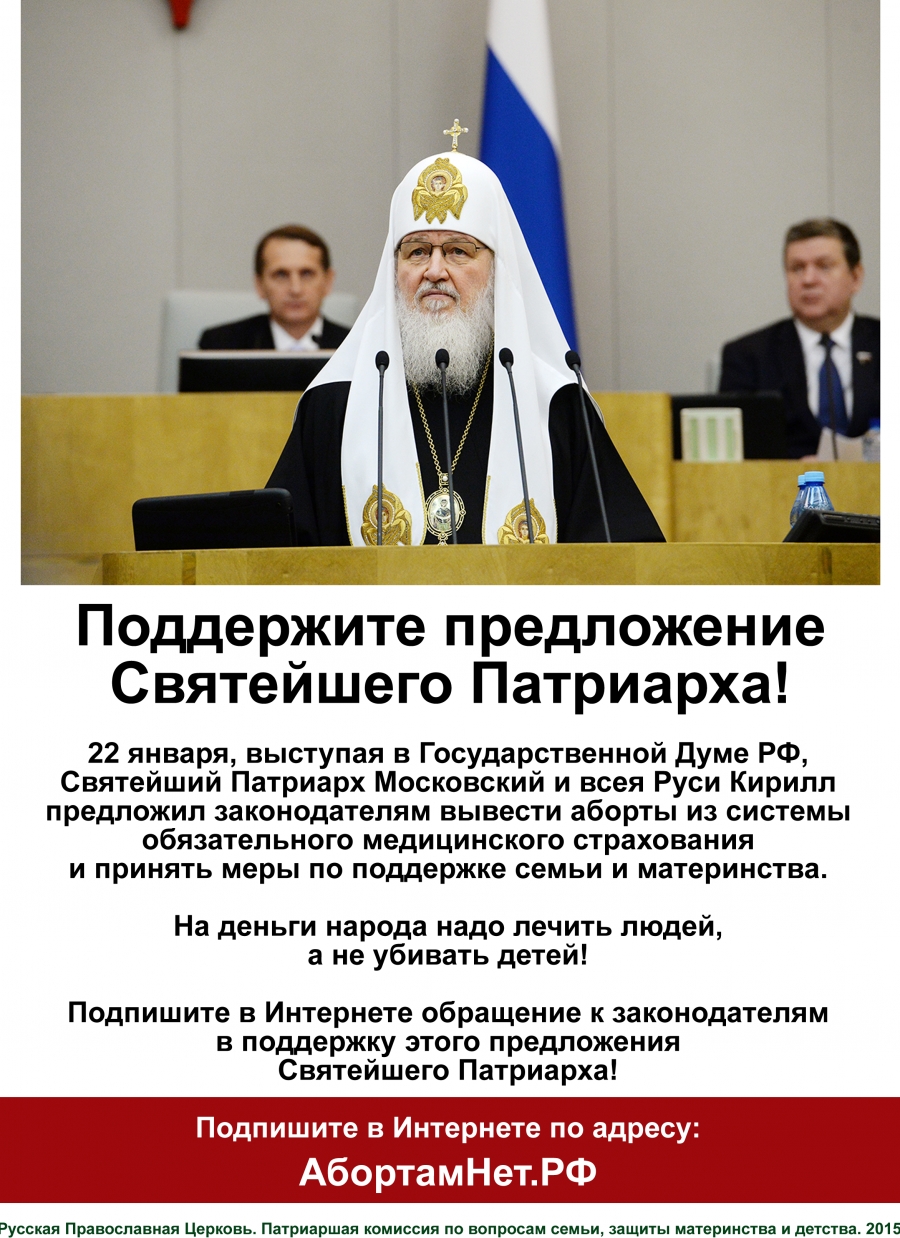 Подпишите в Интернете обращение к законодателям в поддержку этого предложения Святейшего Патриарха!