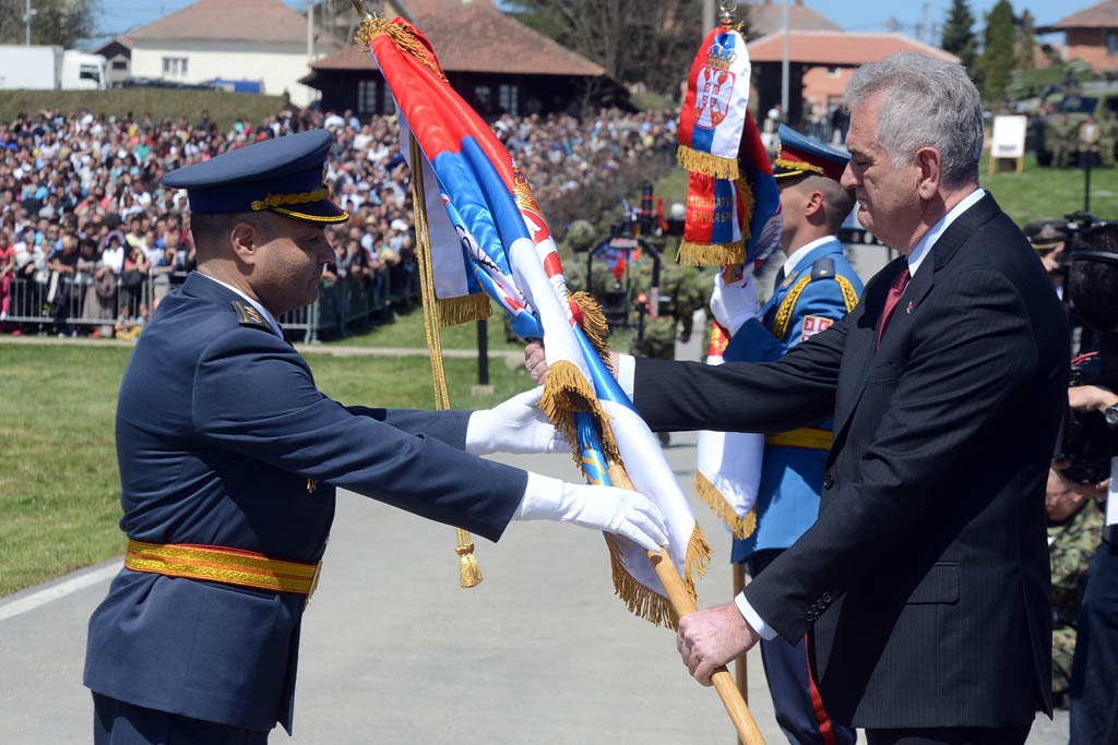 Обраћајући се припадницима Војске Србије као врховни командант, председник Николић је изразио уверење да данас, када пети пут у историји српских војски има част да преда војне заставе које обележавају припаднике система одбране, а у чије спасавање су улагани животи јунака, неће дозволити да оно што представља стуб поверења и што је оличење морала и поштења буде окрњено, а камоли уништено.