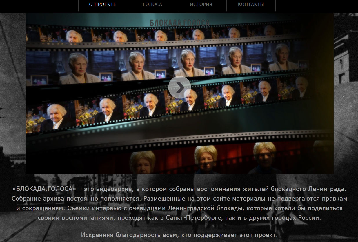 Это видеоархив, в котором собраны воспоминания жителей блокадного Ленинграда. Собрание архива постоянно пополняется. Размещенные на этом сайте материалы не подвергаются правкам и сокращениям. Съемки интервью с очевидцами Ленинградской блокады, которые хотели бы поделиться своими воспоминаниями, проходят как в Санкт-Петербурге, так и в других городах России.