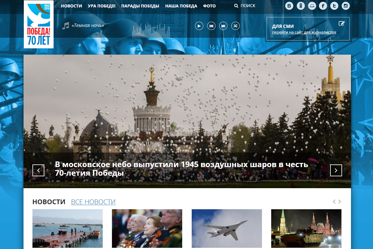 Сайт посвящён празднованию дня Победы. Можно посмотреть парады прошлых лет, проголосовать за «самую» военную песню, узнать расписание мероприятий праздника в этом году.