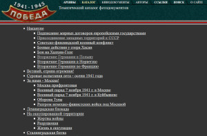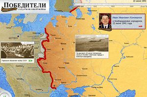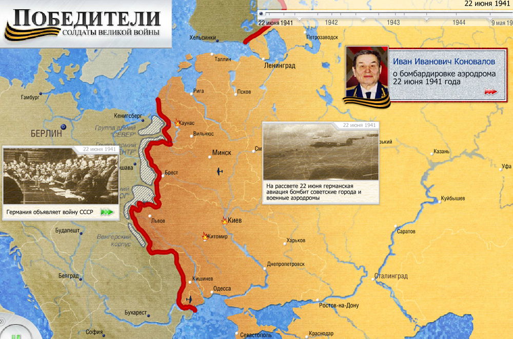 Интерактивная flash-карта, на которой разворачиваются хронология Великой Отечественной войны, дает возможность при наличии по конкретному событию посмотреть видеохронику, прослушать аудиозапись воспоминаний ветеранов, увидеть дополнительную информацию — тексты, фотографии. Кроме того, есть возможность перемещаться по годам войны с помощью специальной шкалы в верхнем правом углу.