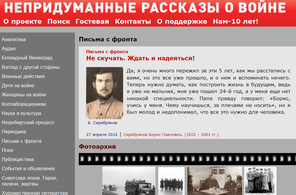 В предпраздничные дни 70-летия Победы мы много слышим, читаем и смотрим о подвиге Великой отечественной войны. «Фома» выбрал 10 сайтов, которые с разных сторон и разными средствами рассказывают о Великой Отечественной войне. Представленная на этих ресурсах информация дает нам возможность хоть в какой степени представить себе — что же такое война в целом: разрушенные города и жизни, Победа, личный подвиг, очень много боли и невыразимая ценность мирного неба над головой.