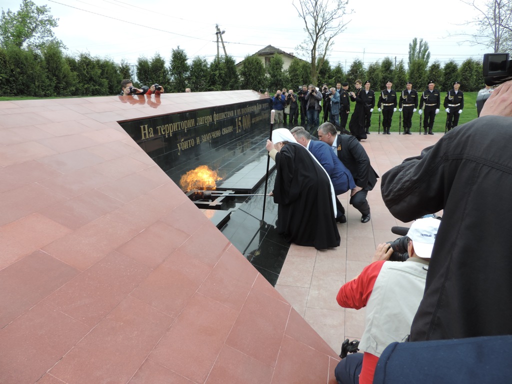 В сопровождении Председателя Мирновского сельского совета С.В.Ковалева присутствующие смогли осмотреть территорию комплекса. Руководство Республики Крым и почетные гости прошли по аллее и возложили цветы к трем памятным знакам, которые расположены в местах ранее существовавших колодцев смерти, обелиску и Поминальному колоколу. В храме в честь священномученика Иоанна (Блюмовича) Его Высокопреосвященство, Высокопреосвященнейший Лазарь отслужил заупокойную литию по жертвам Второй мировой войны. По окончании богослужения Правящий архиерей обратился к присутствующим с архипастырским словом: « Дорогие братья и сестры! Я от всего сердца поздравляю вас с торжественным событием. С семидесятилетием Победы в Великой Отечественной войне. А так же с открытием мемориального комплекса.70 лет прошло с момента освобождения нашего Отечества от немецко-фашистских захватчиков. Память об этом жива в сердцах людей по сей день. В годы Великой Отечественной войны были явлены многие замечательные черты нашего народа. Это и героизм, и мужество, и жертвенность. Но одной из самых главных была явлена горячая молитва и преданность воле Божией. Возносились молитвы как в храме, так и в домах и далеко на фронте. И они были услышаны.Мы сегодня находимся на месте, где были зверски замучены около 15 тысяч человек. И открытие ныне мемориального комплекса, посвященного всем погибшим от рук оккупантов, является очень важным событием не только для Симферопольского района, но и для всего Крыма. Сегодня я хочу призвать всех жителей нашего прекрасного Крыма в эти светлые пасхальные дни вознести свои молитвы о упокоении тысяч и тысяч человек, положивших свои жизни за нашу свободу и благополучие, и всех в годы войны почивших православных христиан.