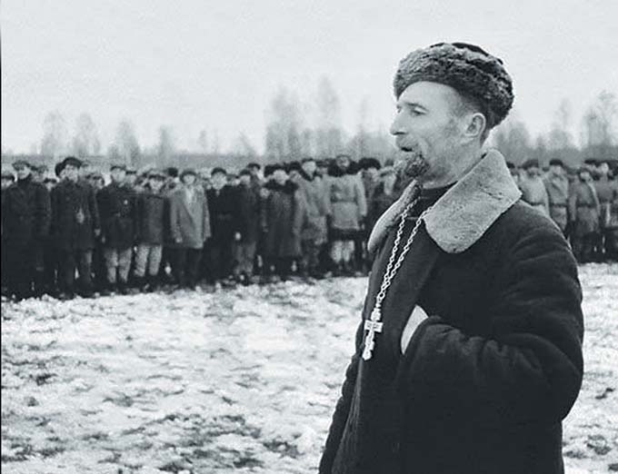 Священник отец Дмитрий (Орловский) благословляет советских бойцов перед боем. Орловское направление, 1943