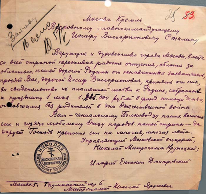 Письмо управляющего Московской епархией митрополита Крутицкого Николая и епископа Дмитровского Иларий Верховному Главнокомандующему И. В. Сталину с просьбой принять собранные верующими к 1 мая 1 225 000 рублей в фонд помощи детям, оставшимся без родителей. ГА РФ, 1944