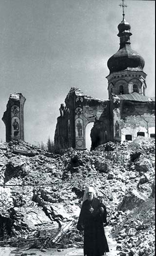 Патриарший экзарх митрополит Галицкий Иоанн у разрушенной немцами Киево-Печерской Лавры. Ноябрь 1943
