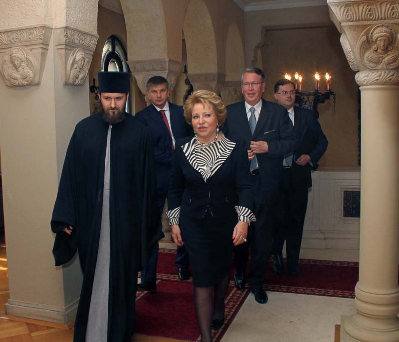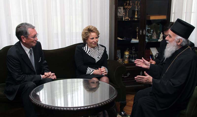 Његова Светост Патријарх српски г. Иринеј примио је данас, 13. маја 2015. године, у Патријаршији српској у Београду гђу Валентину Матвијенко, председницу Савета Горњег дома Парламента Руске Федерације, са сарадницима.