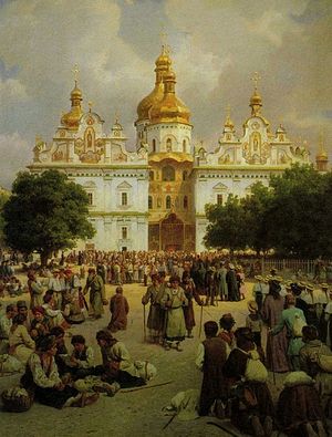 – В середине XIV века на большей части территории современной Украины начинается литовская экспансия. Однако, несмотря на то, что литовский князь Ольгерд, которому подчинялись Киевские земли, первоначально исповедовал языческую веру, а затем, после принятия Кревской унии между Литвой и Польшей, началось усиленное насаждение католицизма, Печерская обитель жила в этот период полноценной жизнью.