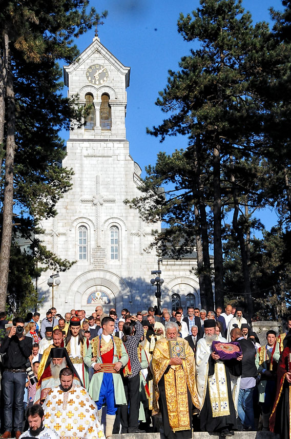 На главном градском тргу, у непосредној близи споменика краља Николе, након прочитаног Светог Јеванђеља, сабрање је благословио Његово Преосвештенство Епископ будимљанско-никшићки Г. Јоаникије, поздрављајући присутне Архијереје: Високопреосвећене Митрополите Г. Амфилохија и Г. Аристарха, те поменуте Епископе, који су се сабрали са разних страна свијета у радости данашњег празника, да нас охрабре, да се обрадујемо нашем заједништву у Христу Исусу Господу нашем.