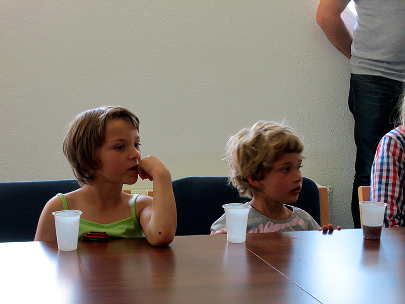 Я смотрю, вы привезли георгиевские ленты. Сейчас придут те, кому вы в Вологде собрали в течение Великого поста помощь. Вот давайте у них спросим, знают ли они об этих лентах и какое отношение у людей к символу Победы.