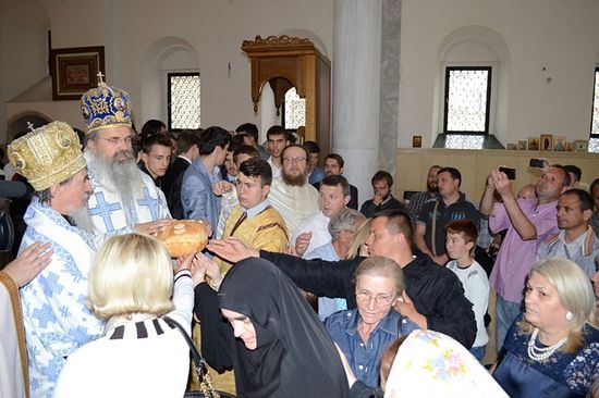 Пред сам крај Литургије благословено је славско жито и колач, након чега је Епископ Теодосије изразио захвалност Епископу Атанасију на дослаку у Призрен и учешћу у прослави Призренске богословије која је символ васкрсења српскога имена у Призрену и која само у своме кругу свакодневно сабира више од 60 Срба.