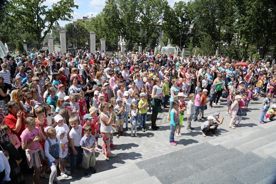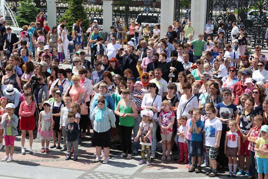 В этот день детский городок приБогоявленском кафедральном соборе наполнился сотнями детей, которые пришли вместе со своими родителями. Не побывав в этот день на Соборной площади, трудно было бы представить, что в военном городе остаётся так много детей. Несмотря на недавние трагические события в Горловке — обстрел жилого квартала, во время которого погибли 11-летняя девочка и её отец, ещё один ребёнок и его мать получили ранения, — страха нигде не чувствовалось. Организаторы праздника и родители постарались доставить детям радость, отвлечь их от мыслей о войне и о том, что это солнечное и по-летнему тёплое небо в любой миг может стать немирным. И, надо сказать, это у них получилось. О войне напоминали лишь разрушенная крыша трапезной собора и мешки с песком на окнах храма. Повсюду, как в былые мирные времена, звучал детский смех, били фонтаны, а в залитое солнцем небо летели тополиный пух и воздушные шары.