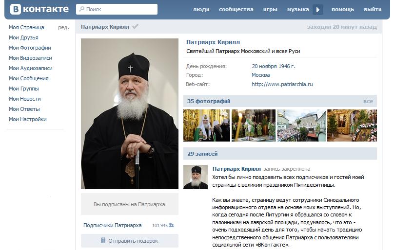 Председатель Синодального информационного отдела В.Р. Легойда сообщил, что за прошедшую с запуска страницы Святейшего Патриарха в социальной сети «ВКонтакте» (http://vk.com/patriarhkirill) неделю, на нее подписалось уже более ста тысяч пользователей сети.