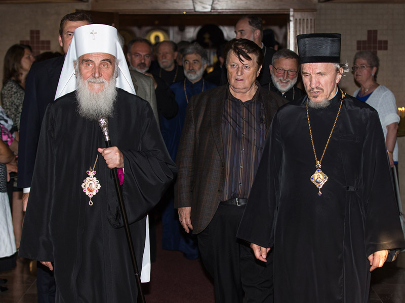Српског Патријарха је дочекао старешина храма протонамесник Дејан Обрадовић, заједно са архијерејским замеником протојерејем-ставрофром Василијем Томићем, протојерејем-ставрофором Лазаром Вукојевим, протојерејем-ставрофором Првославом Пурићем, протјерејем Добрицом Обрадовићем, протојерејем-ставрофором Војиславом Павловићем, протојерејем ставрофором Милован Средојевић, протојерејем-ставрофором Милојком Дмитрићем, оцем Ђуром Самцем, протонамесником Александром Црногорцем - секретаром ЕУО, јерејом Јованом Марјанцом.