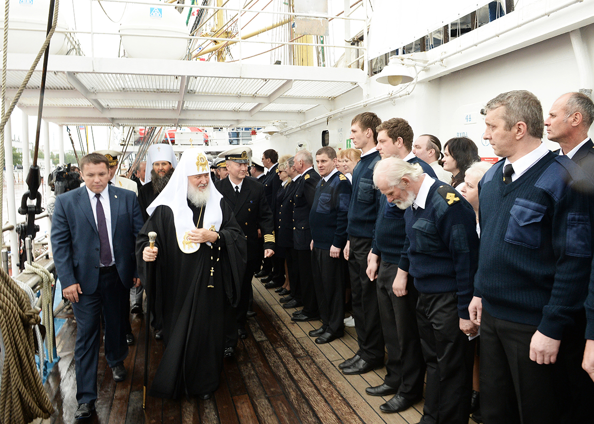 Святейший Патриарх Кирилл поднялся на верхнюю палубу, где его приветствовали капитан парусного судна «Мир» А.В. Орлов и ректор Государственного университета морского и речного флота имени адмирала С.О. Макарова С.О. Барышников.