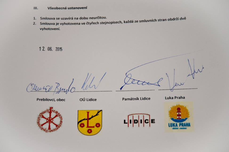 Меморандум, који су потписали предсједница општине Лидице Вероника Келереова, представник села Пребиловци Бранко Екмечић, Весо Ђорем испред Друштва Лука Праха, утврђена су четири основна правца сарадње; васпитно-образовно дјеловање на омладину , истраживачки рад, комеморативно окупљање и узајамна посјета становника два удаљена мјеста која је повезала њихова трагедија у Другом свјетском рату.