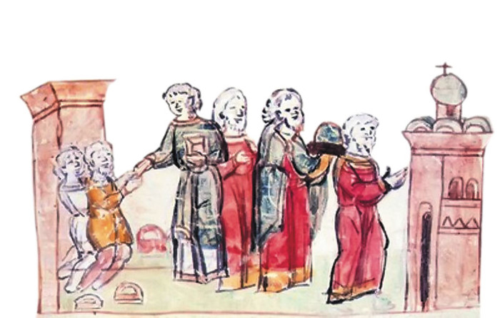 Молитва князя Владимира в десятинной церкви. Миниатюра из Радзивилловской летописи. Конец XV в. Молитва князя Владимира в десятинной церкви. Миниатюра из Радзивилловской летописи. Конец XV в.