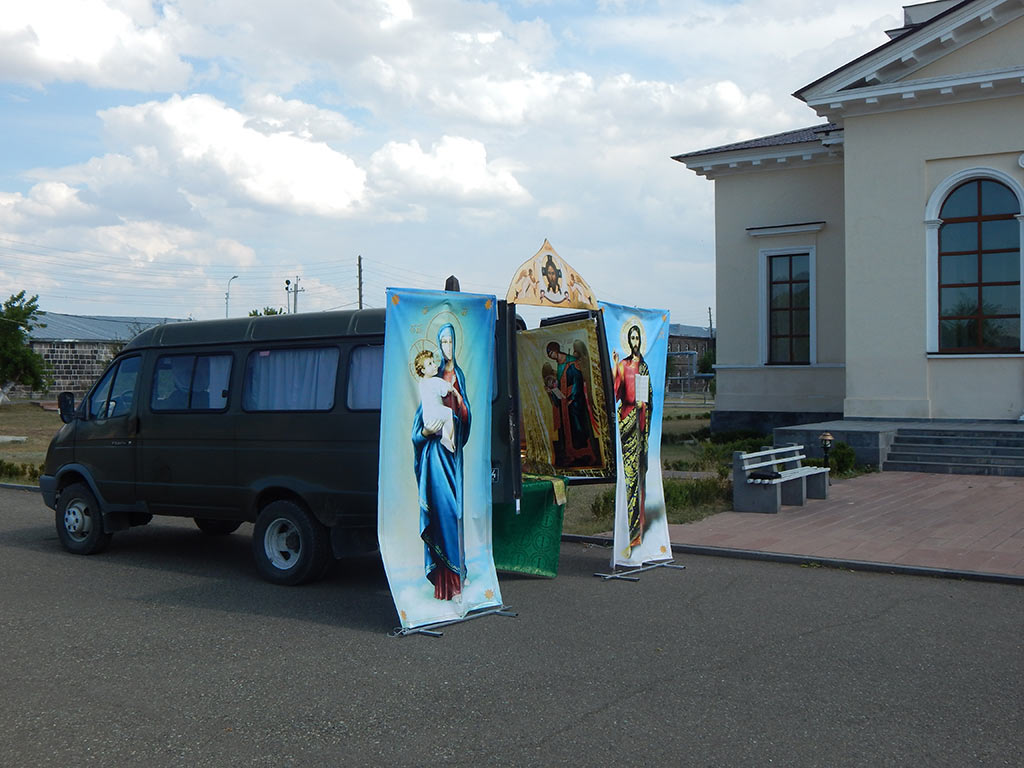 Иконе су направљене на тканини за транспаренте и постављају се на стативе. У случају потребе аутомобилски храм може бити додатно опремљен акустичким системима с појачивачем. Спојене иконе окренуте белом позадином према гледаоцу представљају платно димензија 240 х 240 и у вечерње време се могу користити као прави екран за гледање филмова уз помоћ пројектора.