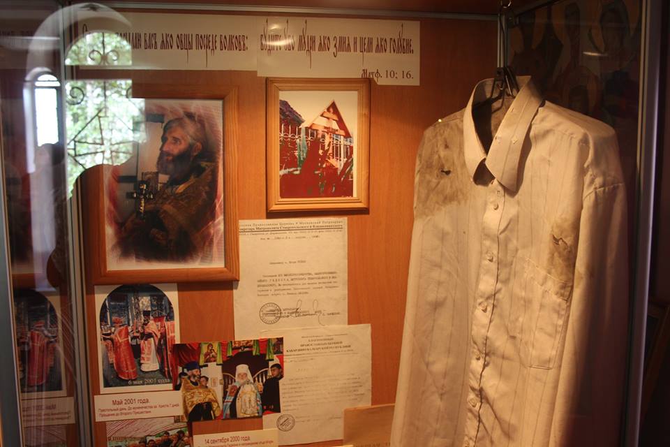 Киот в храме, где хранится рубашка, пробитая ножом убийцы, батюшкин крест, тетрадь с проповедями, открытая на "Слове о смерти"
