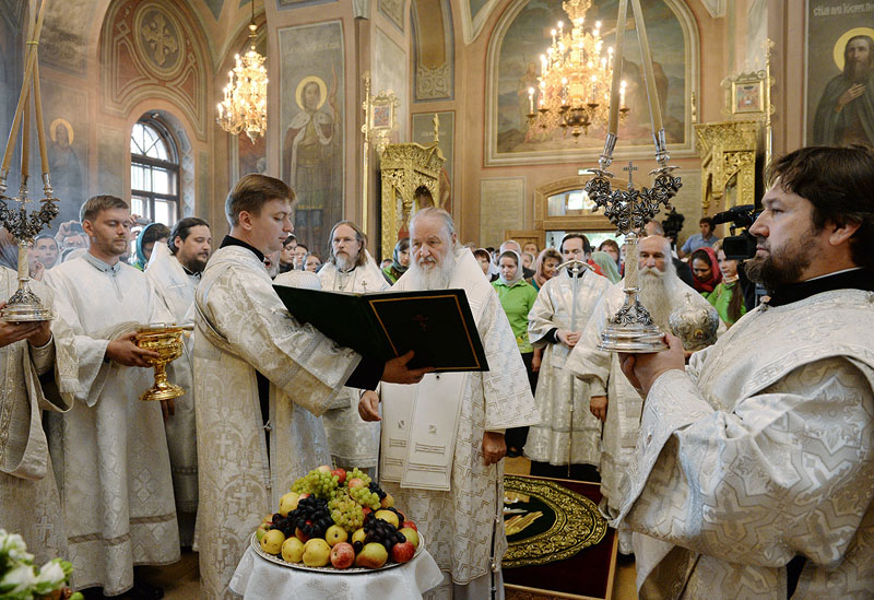 По традиции в праздник Преображения Господня Предстоятель Русской Православной Церкви совершил освящение плодов нового урожая, после чего было совершено славление празднику Преображения Господня.