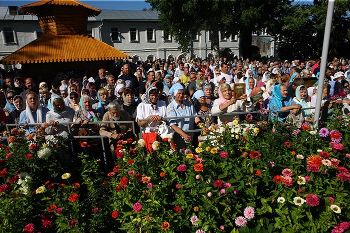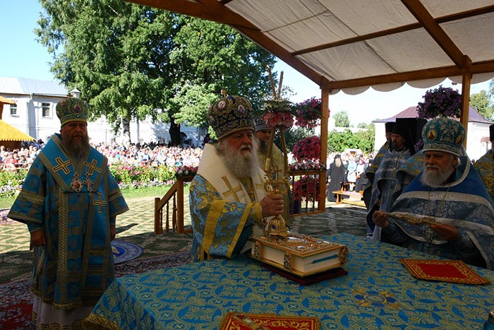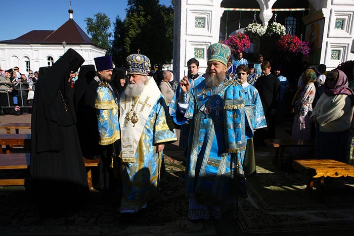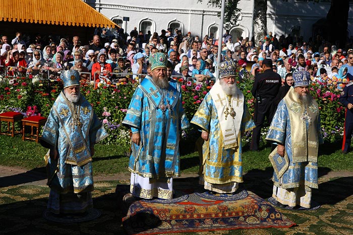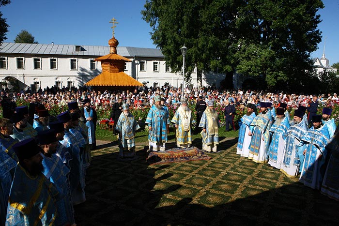 За Литургией, которая совершалась на соборной площади обители, главе Казахстанского митрополичьего округа сослужили митрополит Ярославский и Ростовский Пантелеимон, председатель Учебного комитета Русской Православной Церкви, ректор Московских духовных школ архиепископ Верейский Евгений, епископ Рыбинский и Угличский Вениамин, духовенство Ярославской митрополии и священнослужители, прибывшие на праздник из соседних епархий.