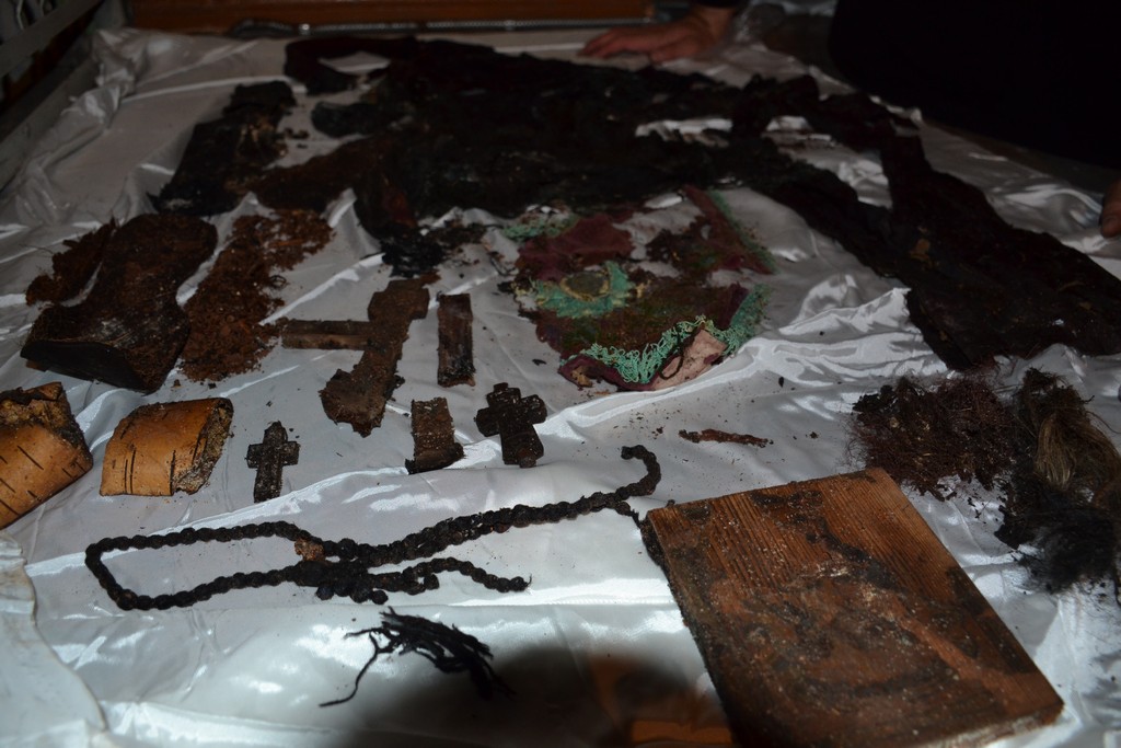 При дальнейшем обследовании были найдены нательный и параманный кресты. Также была найдена монета 1926 года чеканки (преподобный Матфей Яранский отошел ко Господу в 1927 г.).