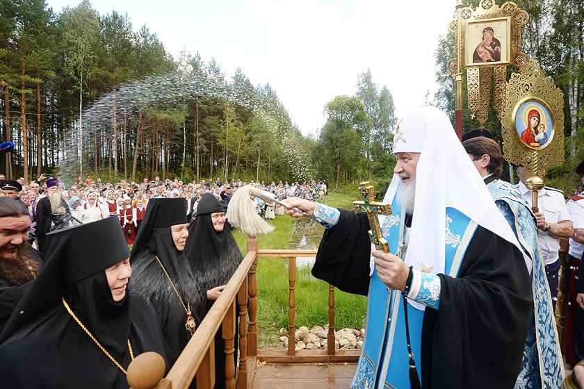Затем Святейший Патриарх Кирилл проследовал к часовне у истока Днепра, где совершил водосвятный молебен.