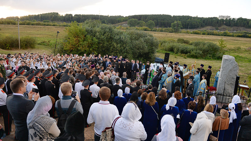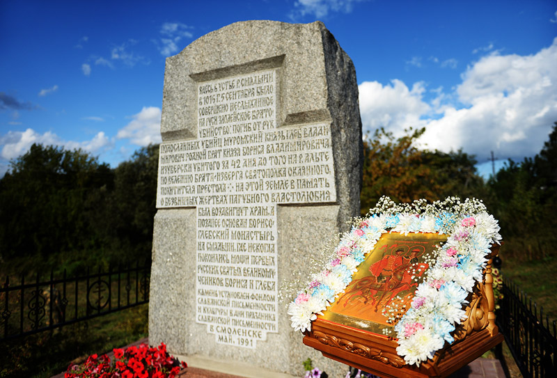 У памятного знака, сооруженного на Смядыни в западной части Смоленска, где, по преданию, был убит князь Глеб, сын святого равноапостольного князя Владимира, Предстоятель Русской Православной Церкви совершил молебен святым страстотерпцам Борису и Глебу.
