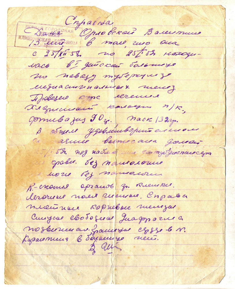Шел декабрь 1949 года. К тому времени Валя уже около двух лет пролежала в больнице. Заболела она после лета, проведенного на детсадовской даче в Евпатории. По возвращении домой у ребенка вдруг начал расти живот. Малышку положили в больницу, долго обследовали, несколько раз собирали консилиум, ставили на табуретку: «Девочка, покажи животик». Ручки-ножки тоненькие, огромный вздутый живот. Выдвигались предположения: водянка, рахит и даже... ложная беременность. Валя так привыкла к уколам, что уже не чувствовала их, но нераспознанная болезнь только прогрессировала. Во время последнего консилиума, в итоге также безрезультатного, она уже не могла стоять не только на табуретке, но и на полу.