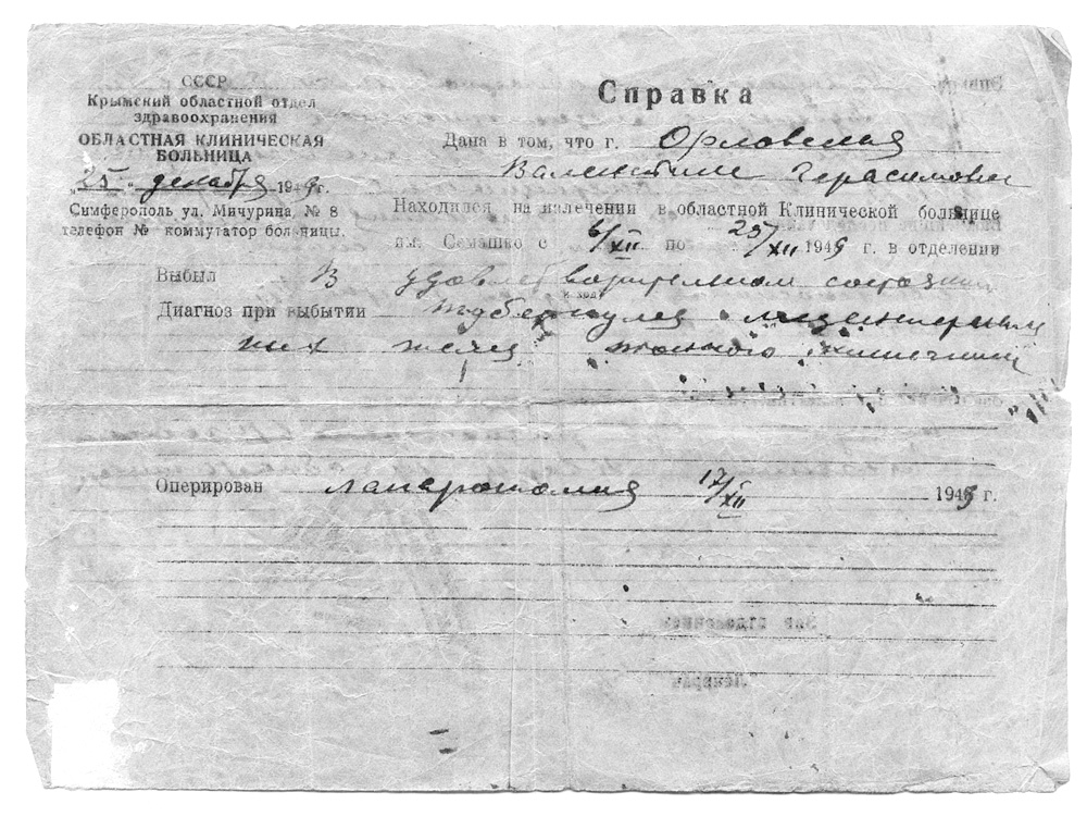В больнице, куда направил Валю Владыка Лука, маму с дочкой встретили не слишком приветливо. Врач, мужчина лет 35-ти, прочитав врачебное заключение профессора Войно-Ясенецкого, долго смотрел на Валю, как бы оценивая ее внешний вид «узника Бухенвальда», после чего заявил, что детского отделения здесь нет, и браться за операцию он не будет: «Кто вас направлял, тот пусть и оперирует. Мне лишнего покойника не надо». Но в том-то и дело, что сам Святитель операций тогда уже не делал, так как плохо видел, и отправил больную девочку в областную, самую оснащенную в те годы в Крыму больницу, зная, что работающие там его коллеги в силах ее спасти.