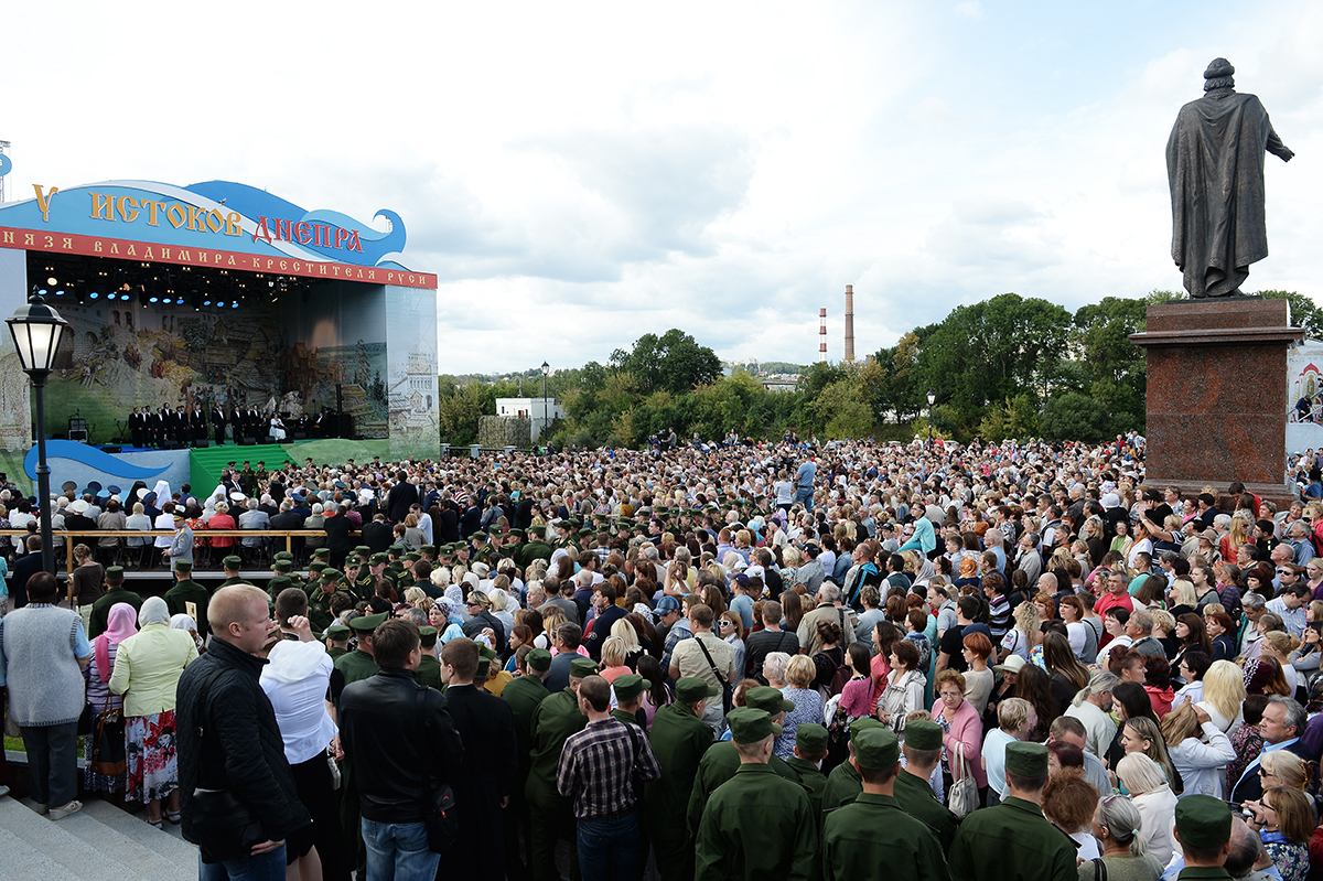 «Мы знаем, что приняли истинную веру. А почему так? А потому что народ изменился, князь изменился, история поменялась, ценности стали другими. И, сохраняя наследие днепровского Крещения, наш народ пронес его через всю свою тяжкую историю. А чего в ней только не было! Нашествия иноплеменников, междоусобные брани, революция, две страшных мировых войны… В самом деле, что могло бы остаться от нашего народа, который всякий раз оказывался в эпицентре мировых конфликтов и всякий раз терпел от этих войн несравнимо больше страданий по сравнению с другими народами и государствами. По крайней мере, к XXI веку ничего бы не осталось от наследия святого князя Владимира, если бы это наследие реально не соединяло нас с Богом и не давало бы духовную и нравственную силу, формирующую облик нашего народа», – заключил Предстоятель.